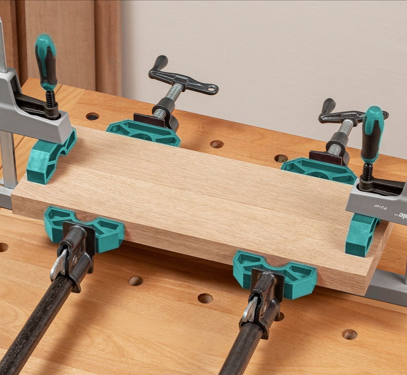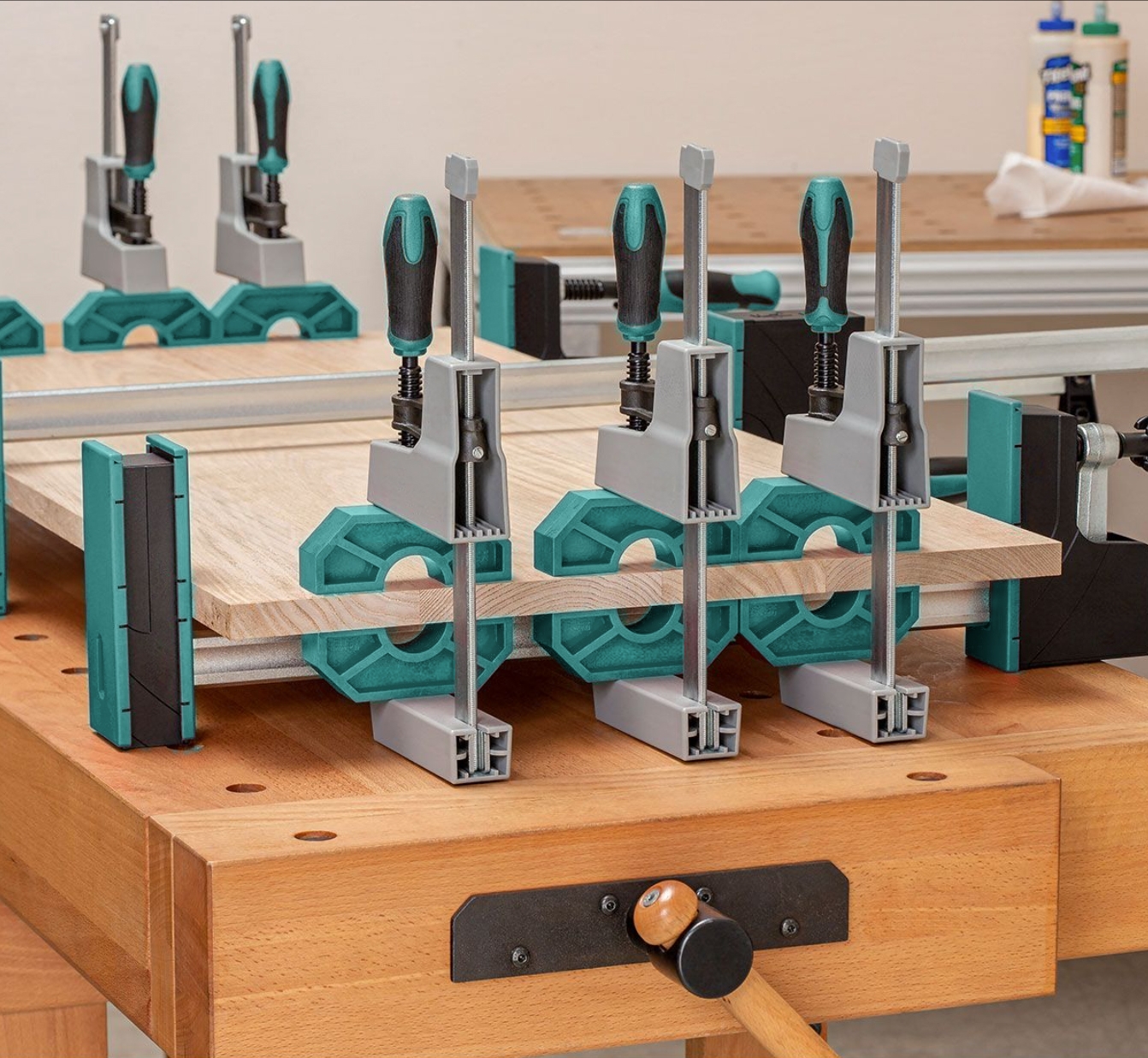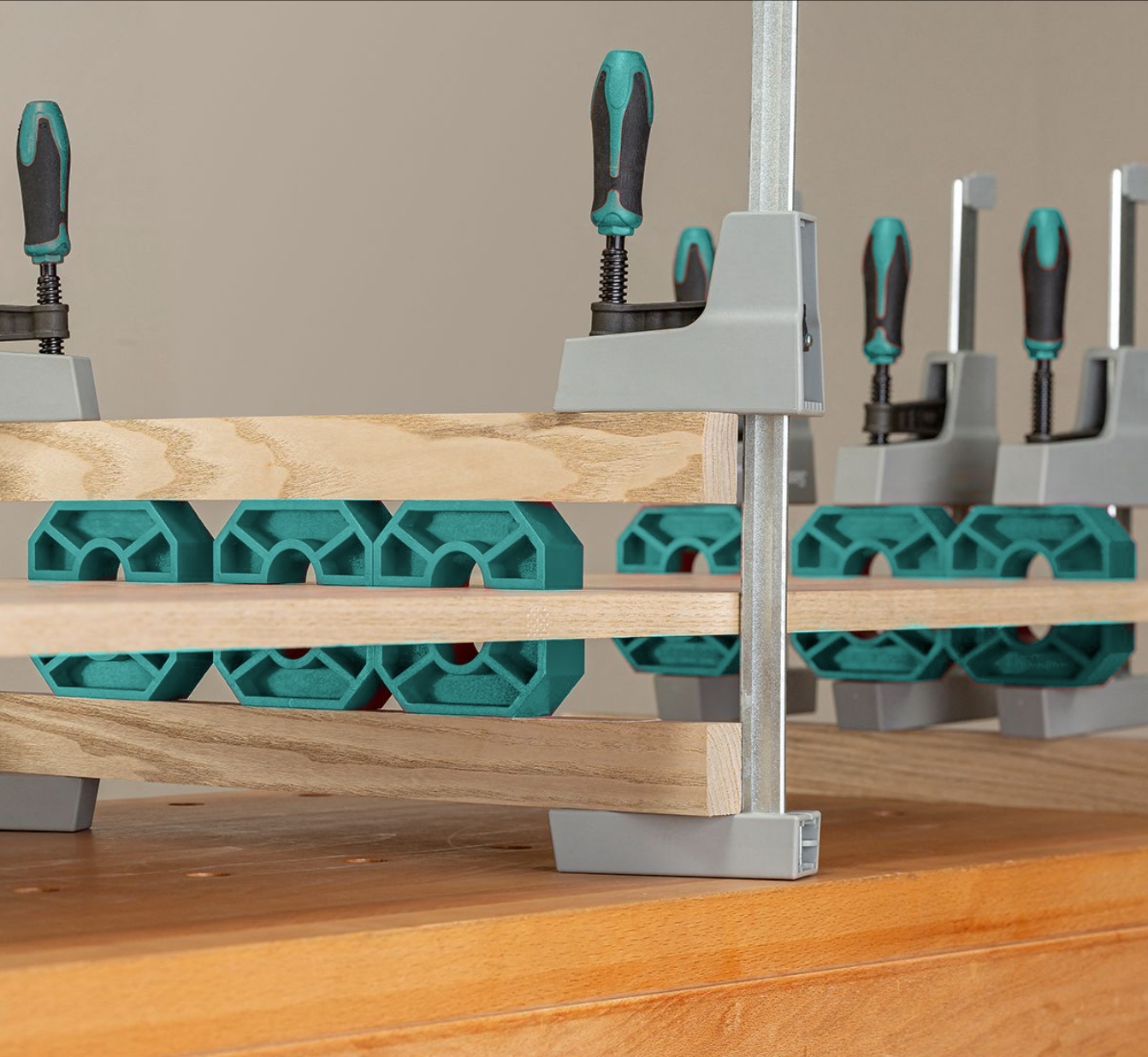 Nuestros puentes de encolado proporcionan una solución a este típico problema. Localizan la presión para nivelar cada unión individualmente sin que se pegue nuestra pieza de trabajo cuidadosamente preparada a las prensas o listones.